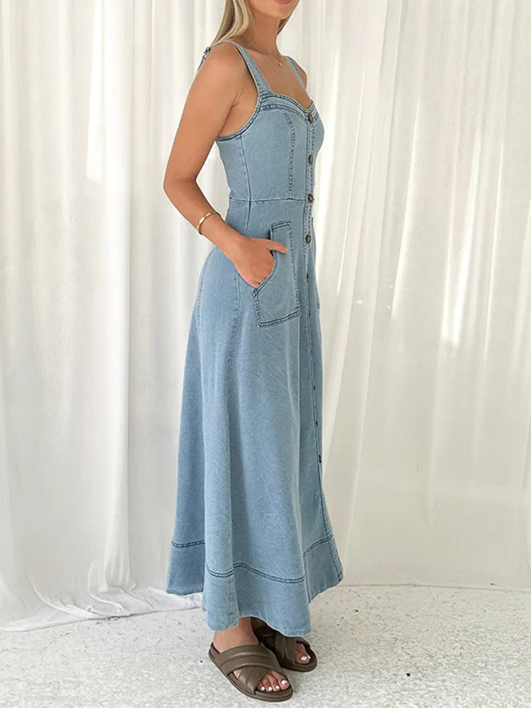 Crafted from premium polyester denim, this high waist maxi dress offers a flattering silhouette that enhances your natural shape while ensuring lightweight comfort.