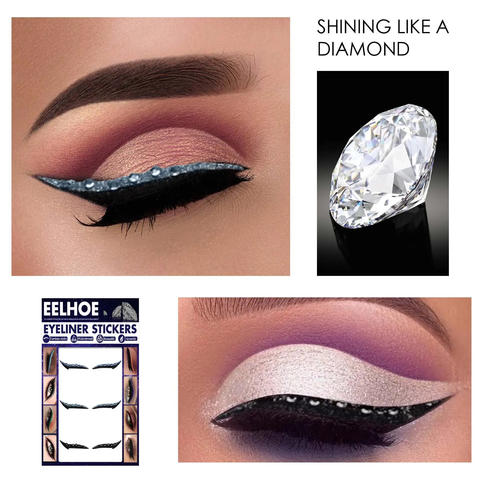 Diamond glitter eyeliner stickers for a dazzling, winged eye look