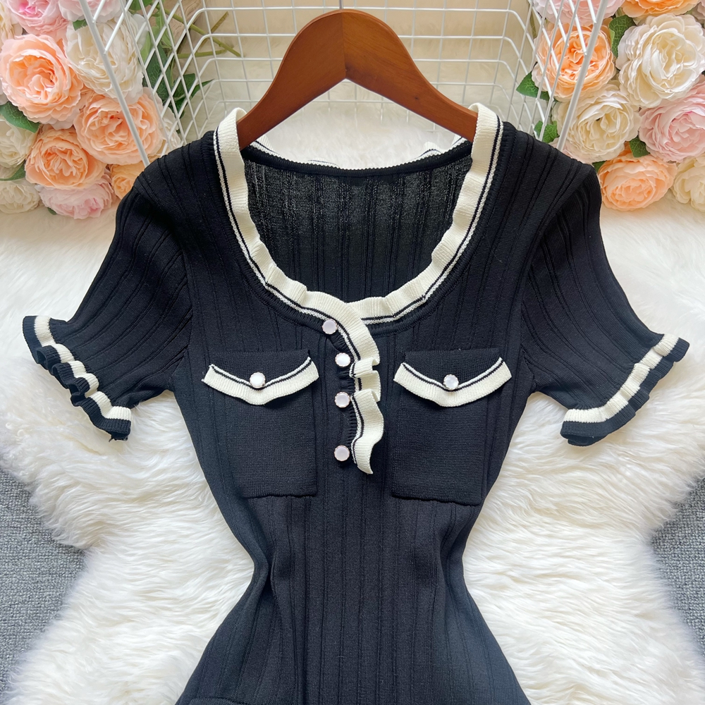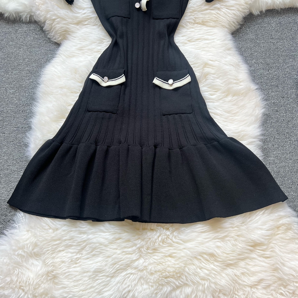 Elegant Black Ruffled Mini Dress – Knitted V-Neck Design