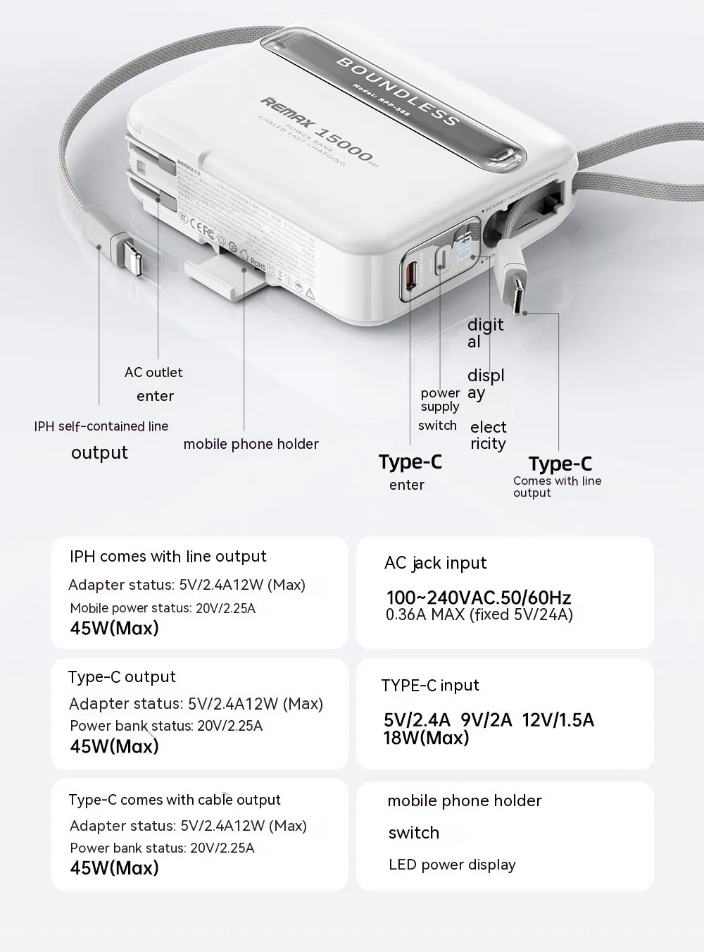 Built-in USB-C and Lightning cables for convenience
