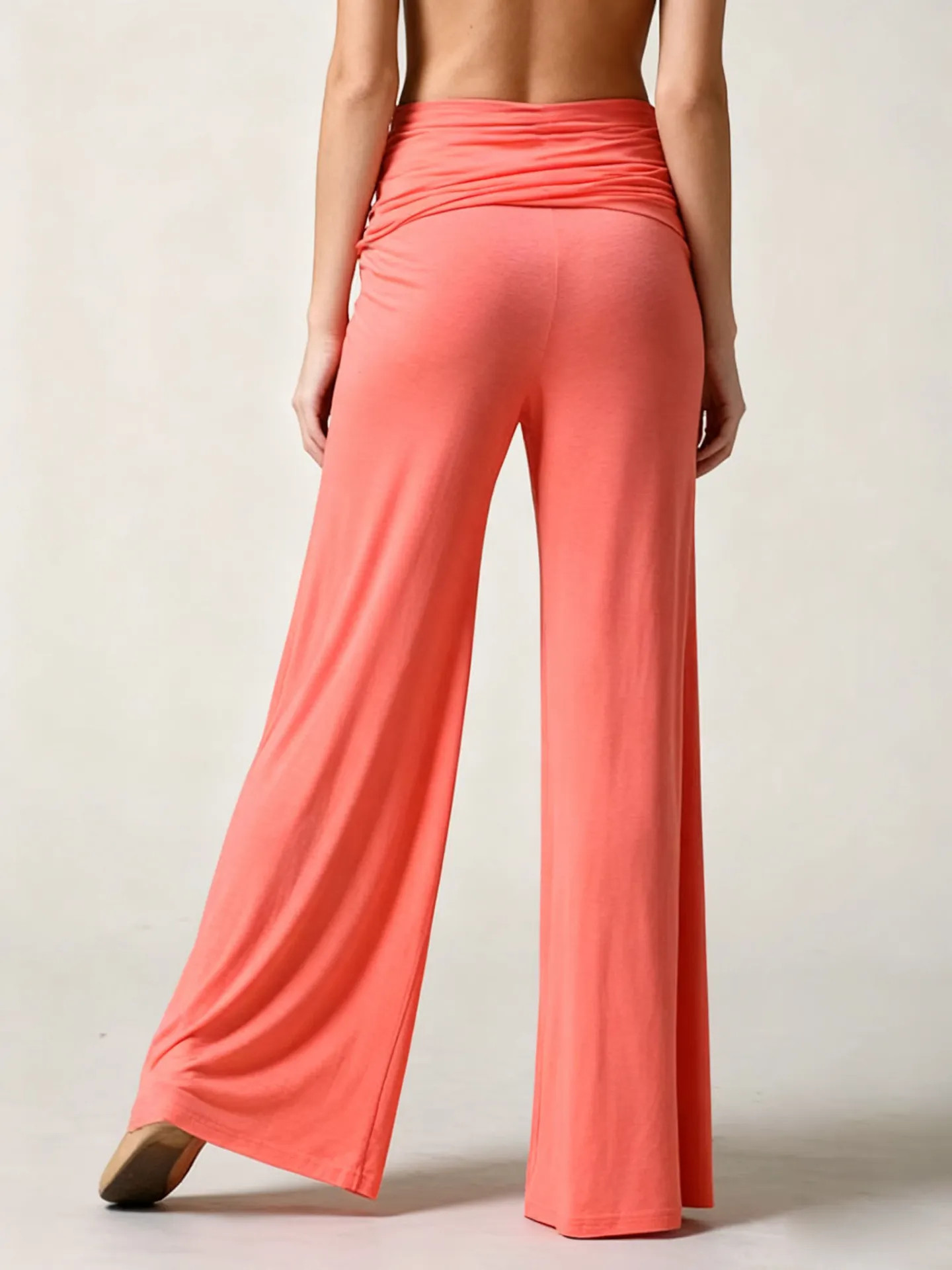 Featuring a ruched fold-over waistband and a flowing wide-leg silhouette, these full-length pants create a flattering, relaxed fit that moves beautifully with you—perfect for yoga, lounging, travel, or casual day-to-day wear.