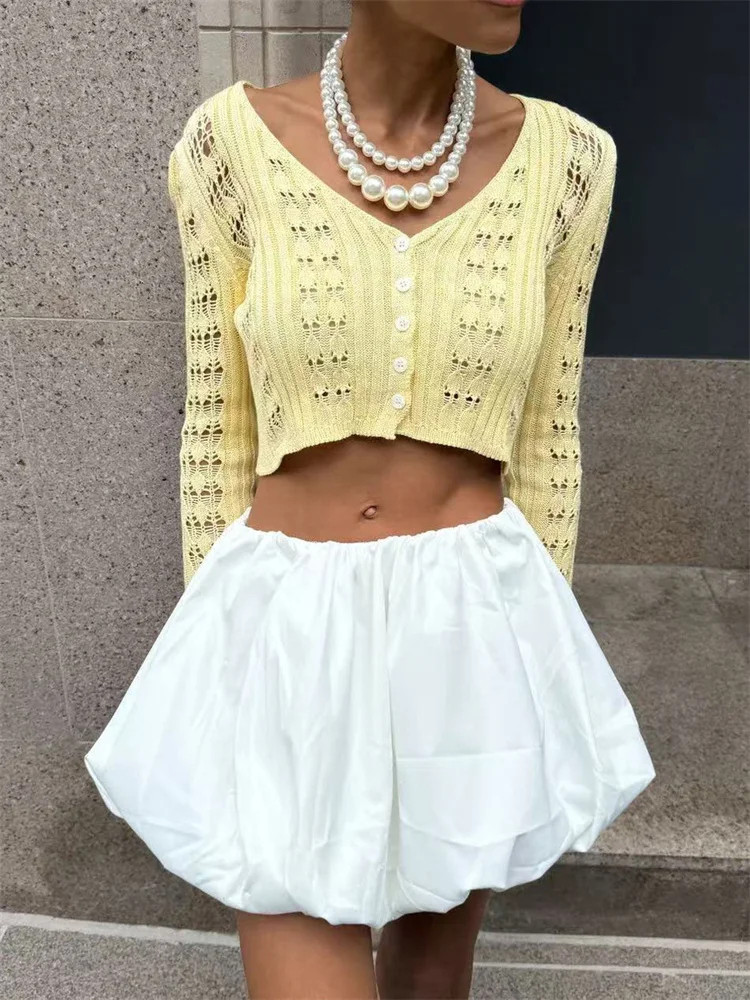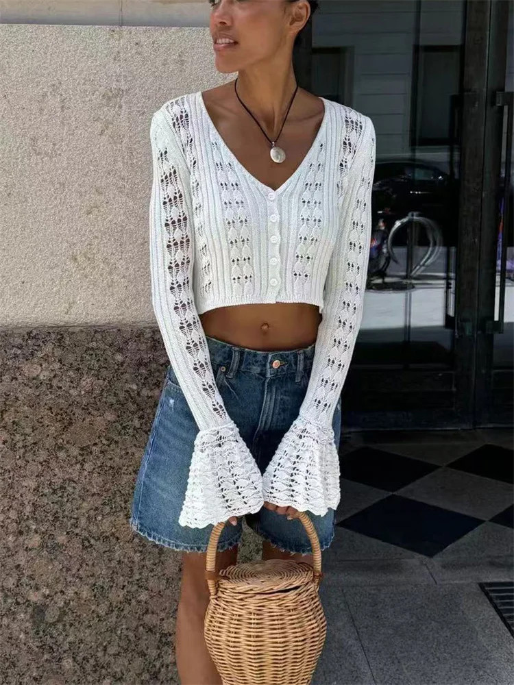 Introducing the hollow out crop top – Summer Knit V-Neck Long Sleeve Women’s Sweater, a chic and versatile addition to your warm-weather wardrobe.