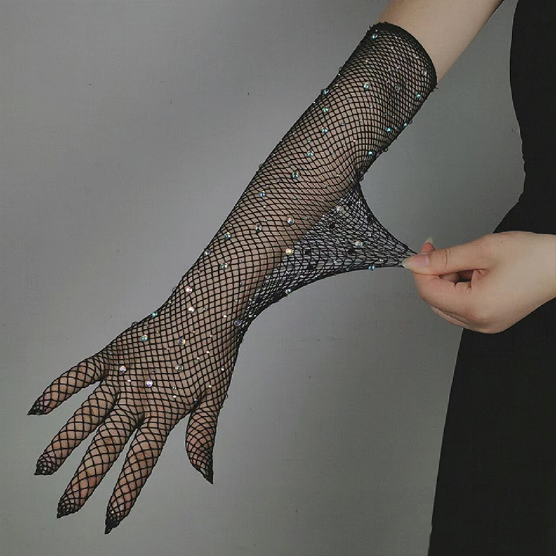 Elevate your party style with our long fishnet rhinestones gloves, blending dazzling sparkle and retro elegance in a soft, stylish stretch fit—perfect for evenings, performances, or fashion-forward events.