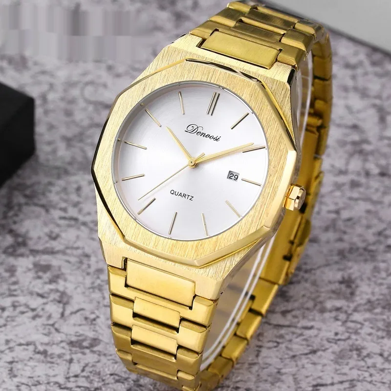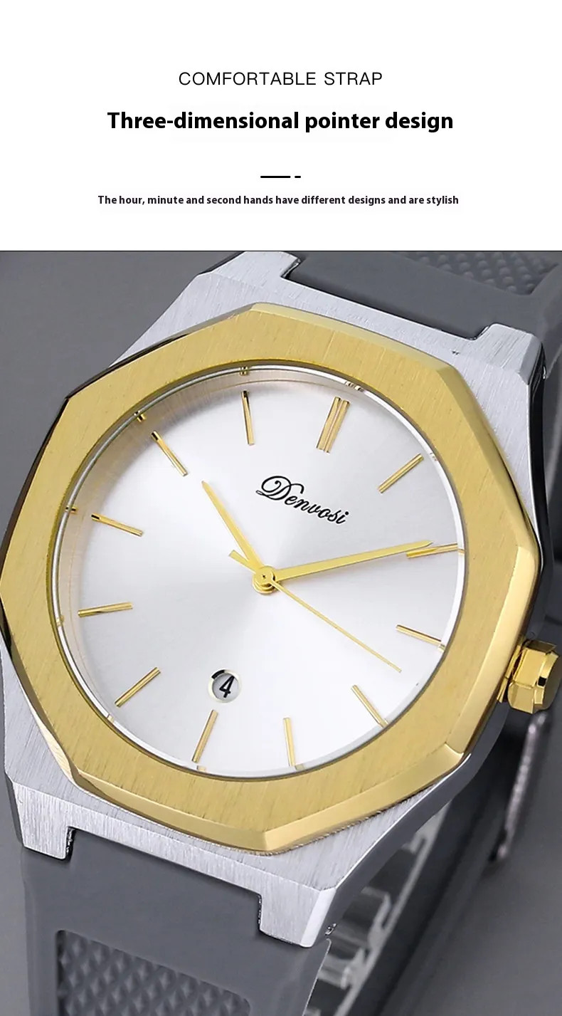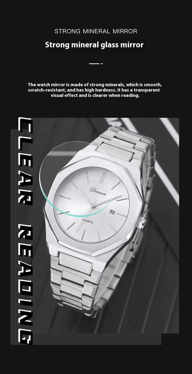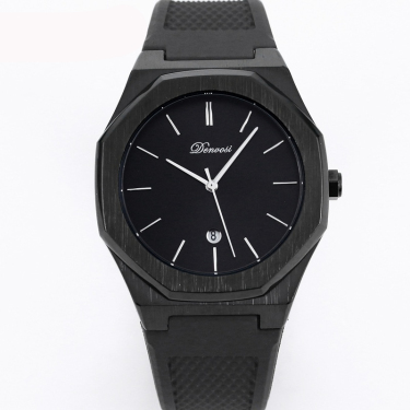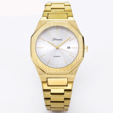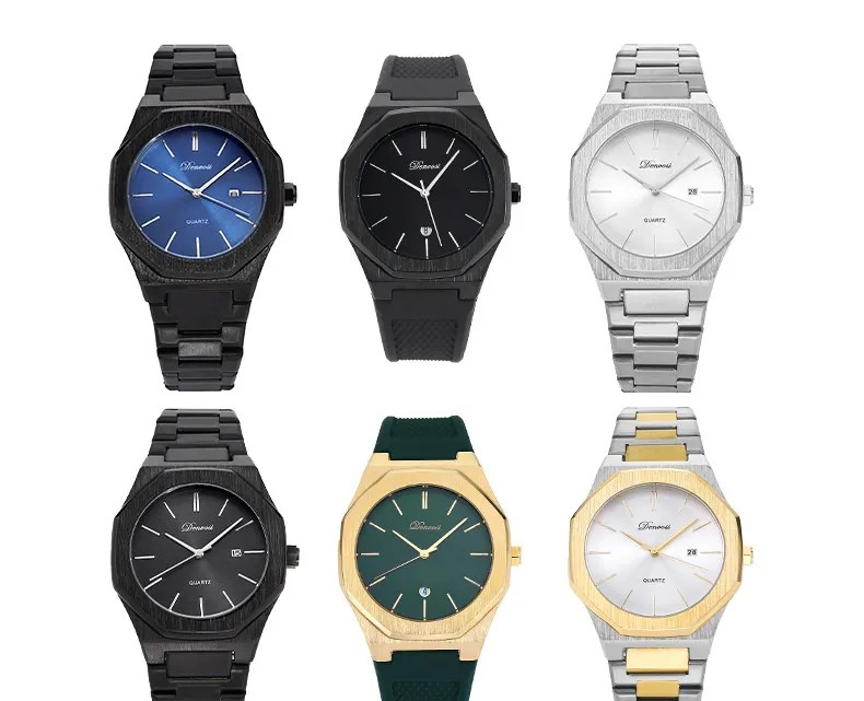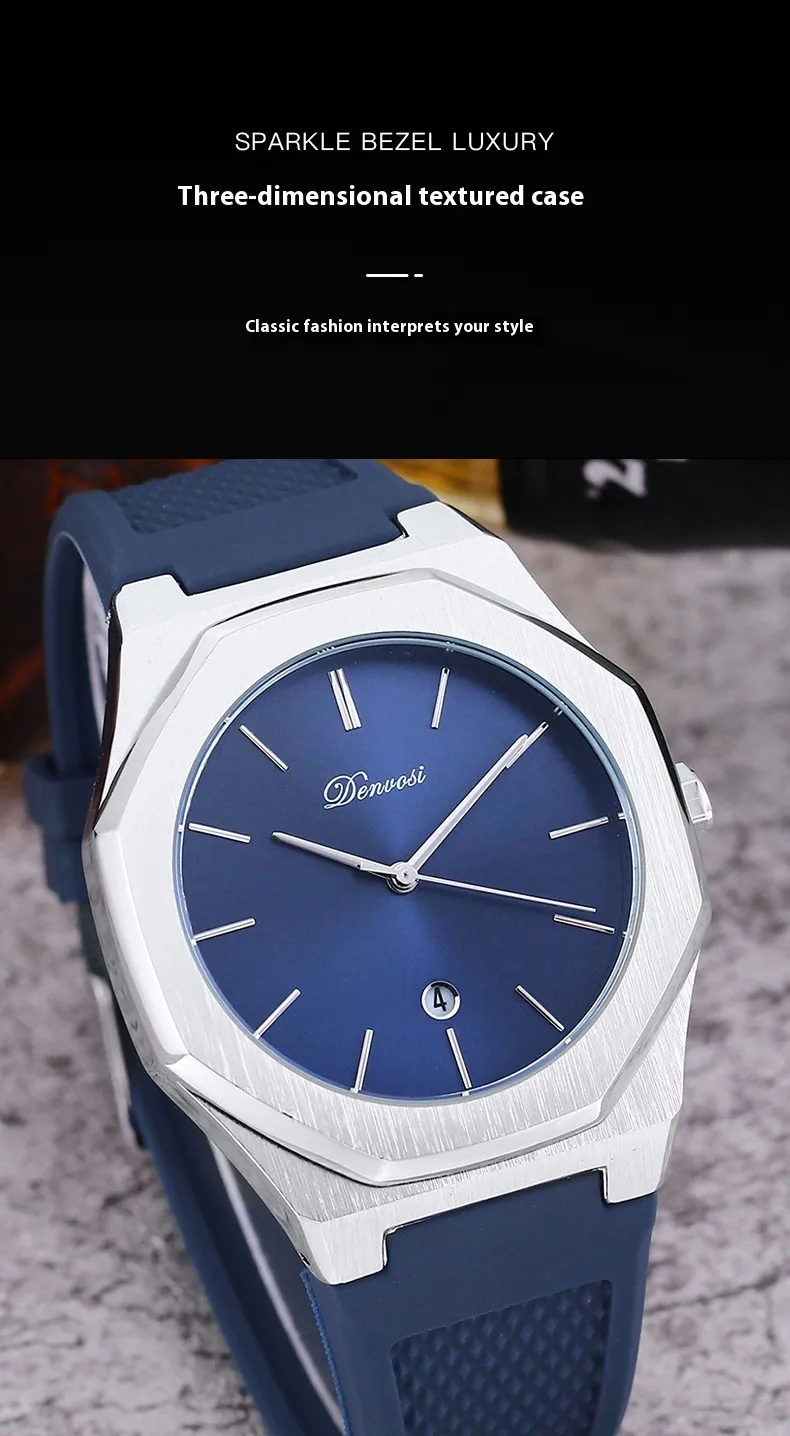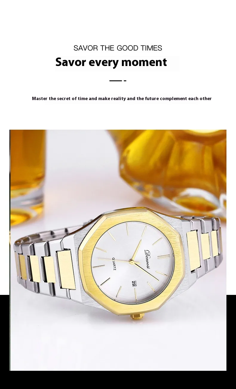 The minimalist quartz watch stands out with its unique octagonal case and refined dial layout. Its balanced design emphasizes simplicity while maintaining a bold visual presence.