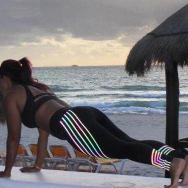 The glowing reflective stripe detailing is not just stylish—it’s functional, improving visibility in low-light conditions for safer nighttime workouts. Pair them with matching sports bras for a coordinated and confident athletic outfit.