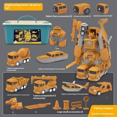 Available in 26-piece or 35-piece sets, each kit includes a large combination robot, transformable engineering vehicles, and a convenient storage box for easy cleanup and organization.
