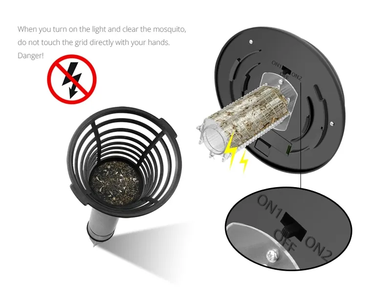 With a simple switch, you can toggle between lighting mode (“ON2”) and bug zapper mode (“ON1”), giving you full control based on your needs.