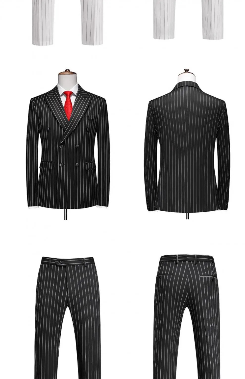 This men’s 2-piece set features a sharp double-breasted blazer with classic pinstripes and matching pants, delivering a sleek, urban look with a modern slim-fit silhouette.