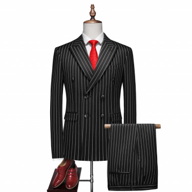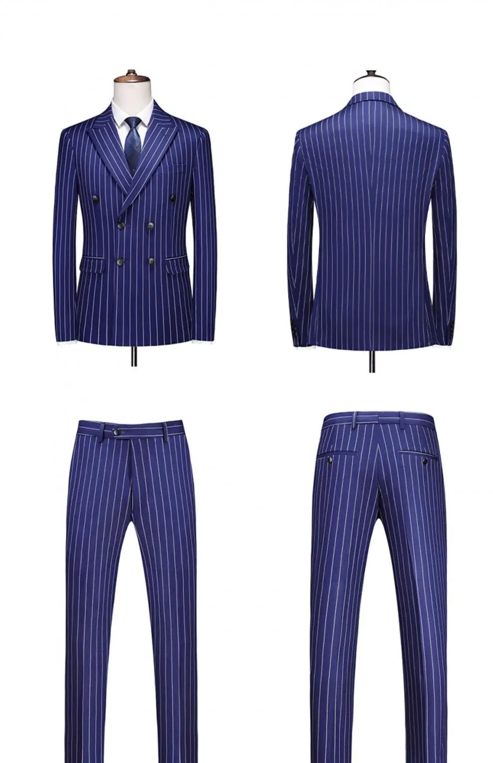 This men’s 2-piece set features a sharp double-breasted blazer with classic pinstripes and matching pants, delivering a sleek, urban look with a modern slim-fit silhouette.