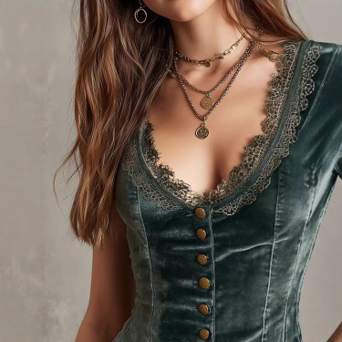 In a rich dark green shade, this sleeveless vest blends soft velvet texture with delicate lace trim along the deep V-neckline, creating an elegant contrast that instantly elevates any outfit.
