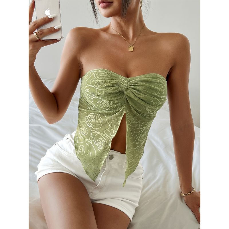 Elevate your style with our Women’s Asymmetrical Tube Top – Sheer Mesh Strapless Crop Style.