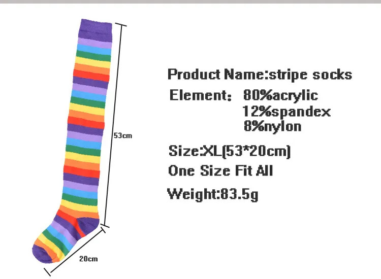 These knee high rainbow socks come in a versatile XL one-size-fits-most fit, with a length of 53 cm x 20 cm, suitable for most women and ideal for pairing with boots, skirts, dresses, or lounge outfits.