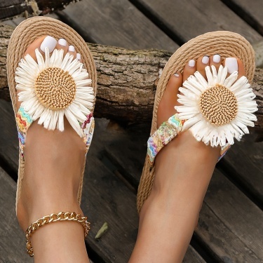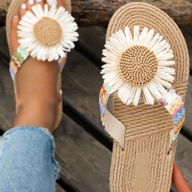 Featuring a braided straw herringbone pattern and a vibrant sunflower accent, these flip flops are perfect for leisure and everyday wear.