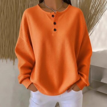 The Women’s Waffle Sweater – Cozy Round Neck Button Down Knit Pullover combines simplicity with street-style appeal, making it a must-have for your cold-weather wardrobe.